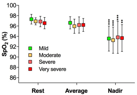 Peripheral saturation at rest (basal), at nadir and the average during the 6-min walk test. Despite the severity, all groups showed a significant desaturation during the test (SpO2rest-nadir **, p < 0.01; ***, p < 0.001). SpO2: Peripheral saturation of oxygen.