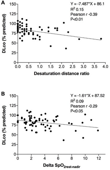 Correlation between the DLco and the DDR (A) and correlation between the DLco and SpO2rest-nadir (B). DLco–SB: diffusing lung capacity for carbon monoxide; DDR: distance desaturation ratio; SpO2: Peripheral saturation of oxygen.
