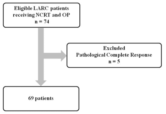 Colorectal cancer (CRC) is the third most common cancer and the second leading cause of cancer-related death worldwide []. Rectal cancer accounts for approximately 30% of CRC cases and has a 5-year survival rate of 67% []. Locally advanced rectal cancer (LARC) is defined as a tumour invading pericolorectal tissues, adjacent organs, or regional lymph nodes. Neoadjuvant chemoradiation therapy (NCRT) followed by surgery (OP) is the standard treatment for LARC and allows for better resectability, anal sphincter preservation, local tumour control, and survival than OP alone [,]. Response to NCRT is correlated with survival in patients with LARC. However, only 18.1% of patients achieve a complete response to NCRT []. Identifying prognostic factors predictive of survival for the remaining patients to guide further management remains an unmet medical need.
