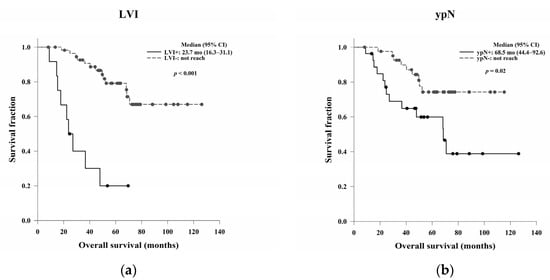 Kaplan–Meier OS curves based on (a) LVI and (b) ypN status. LVI and ypN positivity were significantly associated with worse OS (p < 0.001 and p = 0.02, respectively). Abbreviations: LVI, lymphovascular invasion; ypN, pathological lymph node stage after treatment; OS, overall survival.