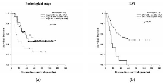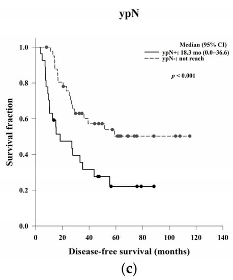 Kaplan–Meier DFS curves based on (a) pathological stage, (b) LVI, and (c) ypN status. A high pathological stage and LVI and ypN positivity were significantly associated with worse DFS (p = 0.04, p < 0.001, and p < 0.001, respectively). Abbreviations: LVI, lymphovascular invasion; ypN, pathological lymph node stage after treatment; DFS, disease-free survival.