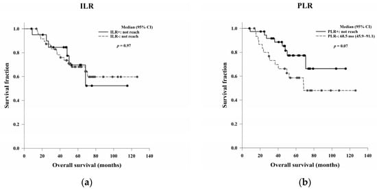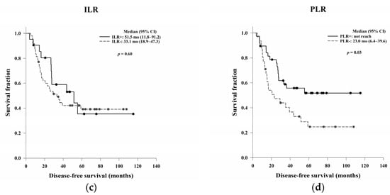 There were no significant differences in OS and DFS based on the ILR (p = 0.97 and p = 0.60, respectively). No significant differences were found in OS based on the PLR (p = 0.07), but the median DFS was significantly higher among patients with PLR positivity than among those without PLR positivity (p = 0.03) (Table 6) (Figure 5).