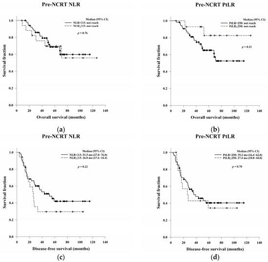 Kaplan–Meier OS curves based on the pre-NCRT (a) NLR and (b) PtLR, and Kaplan–Meier DFS curves based on the pre-NCRT (c) NLR and (d) PtLR. The pre-NCRT NLR and PtLR demonstrated no prognostic power for OS (p = 0.76 and 0.11, respectively) or DFS (p = 0.22 and 0.70, respectively). Abbreviations: NCRT, neoadjuvant chemoradiation therapy; NLR, neutrophil-to-lymphocyte ratio; PtLR, platelet-to-lymphocyte ratio; OS, overall survival; DFS, disease-free survival.
