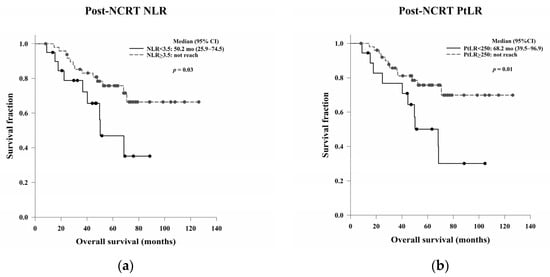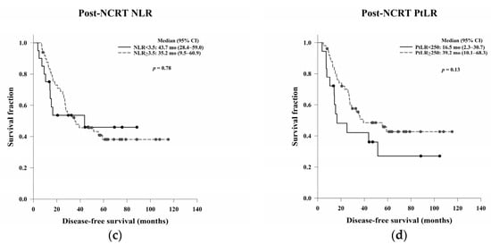 The prognostic abilities of the pre- and post-NCRT NLR and PtLR are shown in Table 7. There were no significant differences in OS and DFS based on the pre-NCRT NLR and PtLR (Figure 6). However, the median OS was significantly higher among patients with a high post-NCRT NLR or PtLR than among those with a low post-NCRT NLR or PtLR (p = 0.03 and p = 0.01, respectively). No significant differences in DFS based on the NLR or PtLR were noted (p = 0.78 and p = 0.13, respectively) (Figure 7).