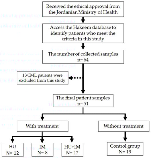 Venous blood samples of patient cohorts who meet the inclusion criteria were collected throughout August-November 2021 (Figure 1). Those patients were admitted to Al-Basher hospital in Amman, Jordan, for follow-up. The blood samples were immediately processed for both hematological and gene expression (BCL2, PP2A, CIP2A, and WT1). The study comprised blood samples of 51 patients diagnosed with CML and those who had already received treatment. The population size was chosen based on Statistics from the Jordanian Ministry of Health, regarding the prevalence of CML disease in Jordan.