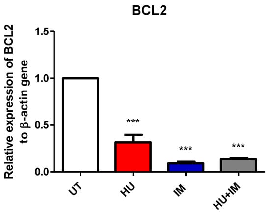The relative expression of BCL2 gene to β-actin gene. Two-tailed paired t-test revealed a significant statistical difference between UT vs. HU, UT vs. IM and UT vs. HU + IM (*** p < 0.005). (mean ± SEM; n = 2).