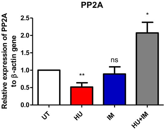 Relative expression of PP2A to β-actin gene. Two-tailed paired t-test showed a significant statistical difference between UT vs. HU (** p < 0.01), and UT vs. HU + IM (* p < 0.05). (mean ± SEM; n = 2).