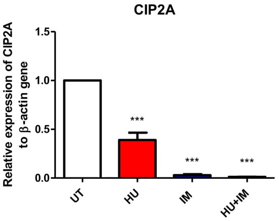 Relative expression of CIP2A to β-actin gene. Two-tailed paired t-test showed a significant statistical difference between UT vs. HU, UT vs. IM, and UT vs. HU + IM (*** p < 0.005). (mean ± SEM; n = 2).