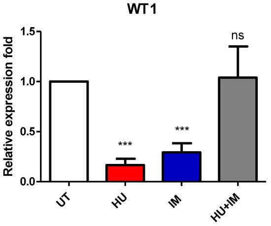 Relative expression of WT1 to β-actin gene. Two-tailed paired t-test showed a significant statistical difference between UT vs. HU and UT vs. IM (*** p < 0.005). (mean ± SEM; n = 2).