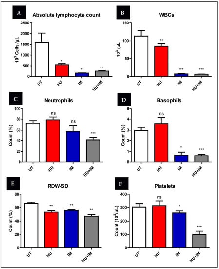 Hematological parameter changes due to IM, HU, IM, and HU treatment of CML patients. (A) absolute lymphocyte count; (B) WBC’s; (C) neutrophils; (D) basophils; (E) RDW-SD; (F) platelets. Two-tailed paired t-test was performed and the statistical difference between the untreated and treated patients is shown in the figures (* p < 0.05, ** p < 0.01, *** p < 0.005).