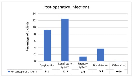 Post-operative infections were observed in 111 (22.7%) patients, after a median time of 10 days (IQR 10.25 days). Respiratory infections were the most common (Figure 1). Moreover, multiple site infections were observed in 19 (3.9%) cases, with bacteremia and respiratory infection being the most frequent association. Other sites of infection included gastrointestinal tract (three cases) and male genital system (one case).