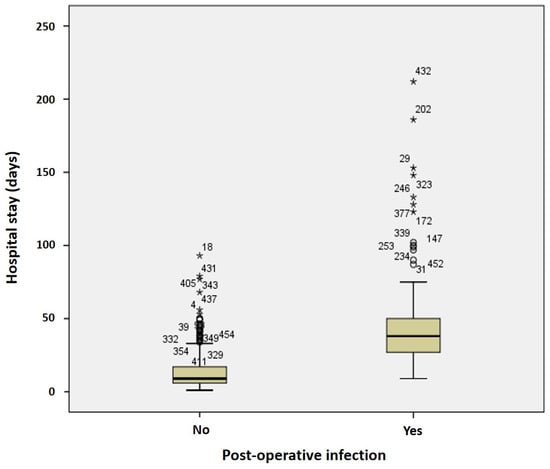 Infections were observed in 10.9% and 36.0% of cases in patients with early (stage I–II) and advanced (stage III–IV) cancer, respectively (p = 0.048). Patients with tracheotomy had infection in 39.3% of cases, compared to 6.5% in those without tracheotomy (p = 0.039). Median duration of surgery was 320 and 150 min in patient with and without post-operative infection, respectively (p = 0.001). Median hospital stay was significantly longer in patients who had post-operative infection (38 vs. 9 days, p < 0.001, Figure 2).