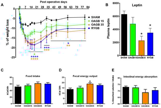 Shortening the BPL of OAGB affects body weight, but not food intake and absorption. (A) Weight loss and regain according to surgical procedure during 24 post-operative weeks expressed as % of initial weight. * p < 0.05; ** p < 0.01, *** p < 0.001, **** p < 0.0001 for OAGB-15 (green) OAGB-35 (orange) or RYGB (blue) vs. Sham (black) animals by Dunnett’s multiple comparison tests after 2-way RM ANOVA. (B) Plasma leptin levels in fasted animals 75 days post-operation. * p < 0.05 versus Sham animals by Dunn’s multiple comparison tests after Kruskal–Wallis Test. (C–E) Daily food intake (C), fecal energy outputs (D) and calculated intestinal energy absorption (E) during the 6th post-operative week. * p < 0.05 for OAGB-35 vs. Sham, no statistical difference was observed after Kruskal–Wallis Test. Data are expressed as means ± SEM, SHAM n = 6, RYGB n = 6, OAGB15 n = 5, OAGB35 n = 4.
