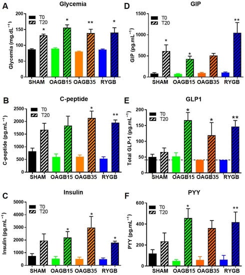 Shortening the BPL of OAGB preserves the altered secretion of pancreatic and gut hormones in response to a meal. Glycaemia (A) C-peptide (B), insulin (C), GIP (D), GLP1 (E) and PYY (F) levels in the plasma of rats before or 20 min after oral administration of a meal composed of glucose and lipids. * p < 0.05; ** p < 0.01, T20 versus T0 by Dunn’s multiple comparison tests after Kruskal–Wallis Test. Data are expressed as means ± SEM, SHAM n = 6, RYGB n = 6, OAGB15 n = 5, and OAGB35 n = 4.
