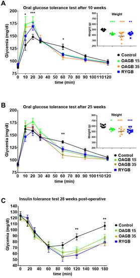 Shortening the BPL of OAGB maintains amelioration of glucose control in non-obese rats. (A,B) Glycaemia during an oral glucose tolerance test performed on week 10 (A) or 25 (B) post-surgery * p < 0.05 and ** p < 0.01, for control (black) animals versus animals operated on bariatric surgery by Dunnett’s multiple comparison tests after 2-way RM ANOVA. Inserts: corresponding weight of the animals * p < 0.05; ** p < 0.01, *** p < 0.001 for OAGB-15 (green) OAGB-35 (orange) or RYGB (blue) vs. Control (black) animals by Dunn’s multiple comparison tests after Kruskal–Wallis Test. (C) Glycaemia during an insulin tolerance test performed on week 28 post-surgery. ** p < 0.01 for control (black) animals versus animals operated on bariatric surgery by Dunnett’s multiple comparison tests after 2-way RM ANOVA. Data are expressed as means ± SEM, Control n = 8, RYGB n = 10, OAGB15 n = 11, OAGB35 n = 10.