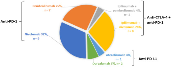 Thirteen patients (46.4%) were treated for malignant melanoma, including one for uveal melanoma, six (21.4%) for lung adenocarcinoma, three (10.7%) for pulmonary squamous cell carcinoma, three (10.7%) for a clear cell renal cell carcinoma, one (3.5%) for parotid adenocarcinoma, one (3.5%) for pleural mesothelioma and one (3.5%) for urothelial cancer. All patients had metastatic cancer at the time of ICPI treatment, except for one patient with unresectable squamous cell lung cancer and two patients with unknown metastatic status.