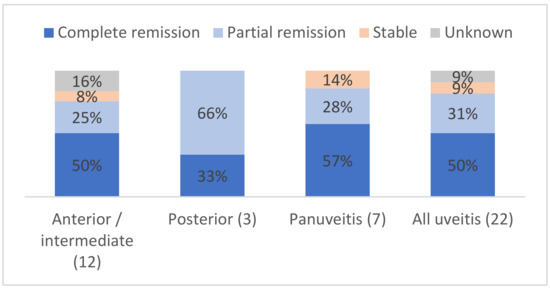 Specifically, the ophthalmological course of uveitis is shown in Figure 2 and detailed for each patient in Table 5. Eighteen (81%) patients had a partial or complete response to treatment. The evolution was unknown for two patients with anterior uveitis. No patient had a worsening of their uveitis at the end of the follow-up. Among the three patients with posterior uveitis, two (66%) patients had partial remission and one (33%) had complete remission. Two (9%) patients had stable uveitis despite treatment: one patient (#6) with subconjunctival steroids, the other (#15) with combinations of intravitreal, topical and i.v. steroids plus other immunosuppressants.