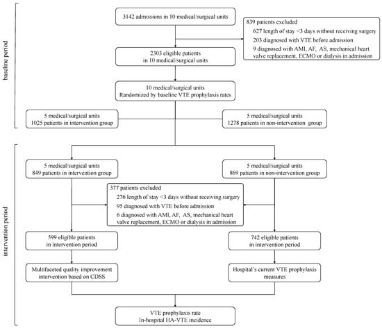 We randomly divided medical or surgical units, based on the prophylaxis rates of each participating unit at the baseline period, into intervention groups and nonintervention groups, to reduce the contamination bias within the same clinical unit. Both groups were asked to include three different units of Orthopedic, Respiratory and Critical Care Medicine, and General Surgery.