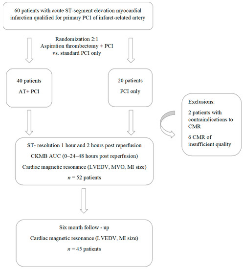 Flowchart detailing the study protocol. Abbreviations: AT—aspirational thrombectomy; AUC—area under the curve; CKMB—creatinine kinase MB isoform; CMR—cardiac magnetic resonance; LV—left ventricle; LVEDV—left ventricle end—diastolic volume; LVEF—left ventricle ejection fraction; MI—myocardial infarction; MVO—microvascular obstruction; PCI—percutaneous coronary intervention.