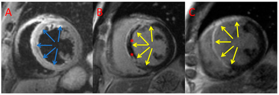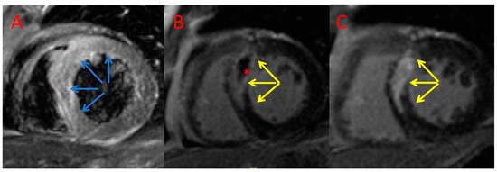 Example CMR images of a patient treated with PCI only. Index T2-weighted triple inversion recovery (A) and late gadolinium enhancement imaging (B) and CMR follow-up late gadolinium enhancement (C) imaging acquired in the short axis. Blue arrows—area at risk; yellow arrows—late gadolinium enhancement; *—microvascular obstruction.