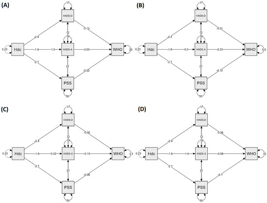 Mediation models for WHO domains: physical health (A), psychological (B), social relationships (C), and environmental (D). Hdc: Headache; HADS: Hospital Anxiety (A) and Depression (D) scale; PSS-10: Perceived Stress Scale.