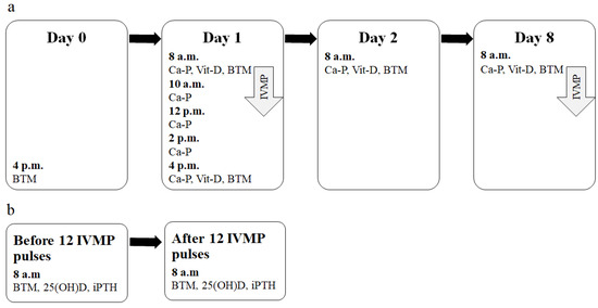 The scheme of the study design. (a) Early evaluation time-points and parameters measured (after a single IVMP pulse). (b) Further evaluation time-points and parameters measured (after the full IVMP therapy). Ca-P—Evaluation of calcium metabolism parameters (Ca, P and Cr in serum and in urine, serum iPTH). Vit-D—Evaluation of vitamin D metabolites (25(OH)D and 1,25(OH)2D); BTM—Evaluation of BTM (P1NP, CTX). 1,25(OH)2D, 1,25-dihydroxyvitaminD; CTX, C-terminal telopeptide of type I collagen; BTM, bone turnover markers; IVMP, intravenous methylprednisolone; 25(OH)D, 25-hydroxyvitaminD, iPTH, intact parathormone; P1NP, amino-terminal propeptide of type I procollagen.
