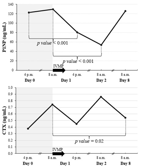 Bone turnover markers (P1NP and CTX) were evaluated on Day 0 (at 4 p.m.), on Day 1 (twice: at 8 a.m. and then 8 h after the beginning of the first IVMP pulse), and on Days 2 and 8 (once, at 8 a.m.). The serum samples were obtained on Day 0 (before IVMP therapy) to avoid the effect of the circadian rhythm on the levels of BTM. The results were compared with the corresponding time points (4 p.m. on Day 1 with 4 p.m. on Day 0; 8 a.m. on Days 2 and 8 with 8 a.m. on Day 1). P1NP and CTX were also assessed after the full course of IVMP pulse therapy (4.5 g IVMP divided into 12 once-weekly pulses).