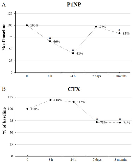 The percentage changes of P1NP (A) and CTX (B) during IVMP therapy with respect to the corresponding baseline values (0). * p value < 0.05 vs. corresponding time point before IVMP therapy. CTX, C-terminal telopeptide of type I collagen; h, hours IVMP, intravenous methylprednisolone; P1NP, amino-terminal propeptide of type I procollagen.