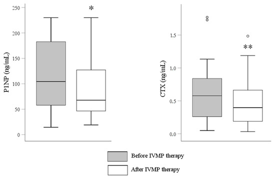 Effect of IVMP therapy (12 weeks with once-weekly intravenous pulses with a cumulative dose of 4.5 g) on P1NP and CTX. * p value < 0.05 vs. before IVMP therapy; ** p value < 0.01 vs. before IVMP therapy; CTX, C-terminal telopeptide of type I collagen; IVMP, intravenous methylprednisolone; P1NP, amino-terminal propeptide of type I procollagen.