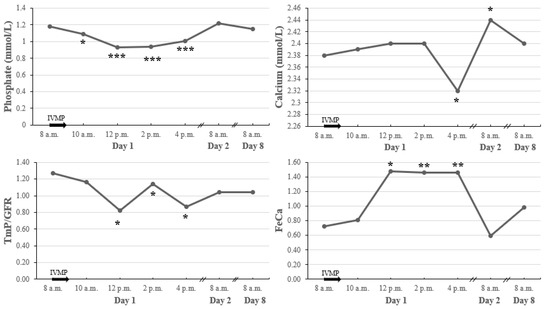 The following calcium metabolism parameters (Ca-P) were measured on Day 1 (five times), on Day 2 (once), and on Day 8 (once): serum levels of Ca, P, iPTH, creatinine (Cr) as well as Ca, P, and Cr in urine. Afterwards, the fractional excretions of calcium (FeCa = urine Ca × serum Cr/serum Ca × urine Cr), as well as tubular maximum reabsorption of phosphate adjusted to GFR (TmP/GFR = serum P − (urine P × serum Cr/urine Cr)) were calculated.