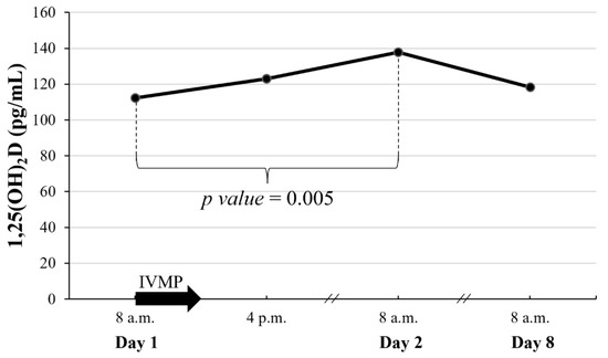 Serum 1,25(OH)2D increased rapidly, peaked 24 h after IVMP administration, and returned to baseline within 7 days (Figure 6). Throughout the course of IVMP administration, there were no changes in 25(OH)D.
