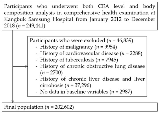 The cut-off value for CEA was set at 5 ng/mL. CEA levels ≥ 5 ng/mL were defined as high CEA levels, whereas CEA levels < 5 ng/mL were defined as normal CEA levels based on a previous study [27]. All laboratory test results were confirmed by the Kangbuk Samsung Hospital Laboratory Medicine Department and validated by the Korean Association of Quality Assurance for Clinical Laboratories and the Korean Society of Laboratory Medicine [28].