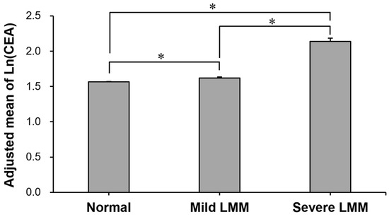 The chi-square test was used to compare categorical variables, and one-way analysis of variance (ANOVA) was used to compare continuous variables. Post hoc Bonferroni analyses were performed for group comparison. The prevalence (%) of high CEA levels in the normal, mild LMM, and severe LMM groups was compared using the chi-square test with post hoc analysis using the Bonferroni method. Furthermore, we used natural log-transformed (ln) CEA levels due to their positively skewed distribution, which was the best-fitting model for analysis, where the CEA level was treated as a continuous variable. Adjusted mean log-transformed CEA values between each group were compared using ANOCVA after adjusting for age, sex, history of hypertension, history of diabetes, and HDL-C, ALT, and CRP levels.