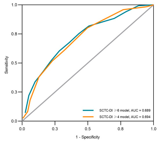 The LASSO logistic regression was used, as outlined in Method, to discover the independent risk factors associated with high organ damage burden in SSc patients. Variables that showed significant differences between high and low burden groups were enrolled in the LASSO regression to identify the most critical risk factors. Patients missing data on ESR were excluded from the regression. As shown in Table 3, anemia (OR = 2.30, 95% CI 1.70 to 4.00, p < 0.001 in SCTC-DI ≥ 6 model; OR = 1.89, 95% CI 1.24 to 2.90, p = 0.003 in SCTC-DI ≥ 4 modified model) was the only independent risk factor associated with the high burden organ damage according to both the original and modified classifications. Age and steroids usage at the baseline were selected in the final evaluating model of the original high organ damage burden, while disease duration was selected for the modified high organ damage burden. Their associated coefficients in the final logistic model are illustrated in Table 2. There were no interactions among the variables in the model, and the variance inflation factor (VIF) of all features in the model was near one. The ROC analysis revealed a good discriminatory capability of assessing the organ damage burden with an area under the curve (AUC) of 0.689 (95% CI 0.636 to 0.742, p < 0.001) in the original high-burden model and 0.694 (95% CI 0.641 to 0.746, p < 0.001) in the modified high-burden model using the original beta weights of these variables (Figure 1). Taken together, anemia was an indicator of a high organ damage burden in both the original and modified classifications. Age, disease duration, and steroid usage at the baseline were also associated with a high organ damage burden.
