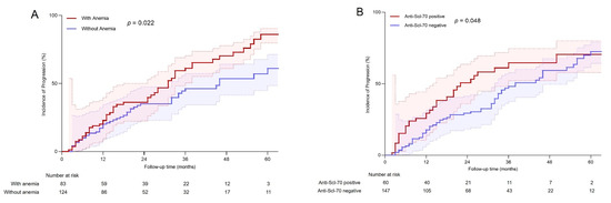 Univariate Cox cumulative incidence plot for time to organ damage progression in SSc patients. (A) With or without anemia; (B) positive or negative anti-Scl-70 autoantibody. SSc, systemic sclerosis.