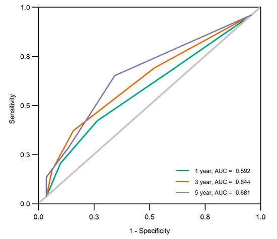 Time-dependent ROC curves for the final prediction model of organ damage progression. The final prediction model included anemia at the initial visit and positive anti-Scl-70 autoantibody. AUC, area under the curve.