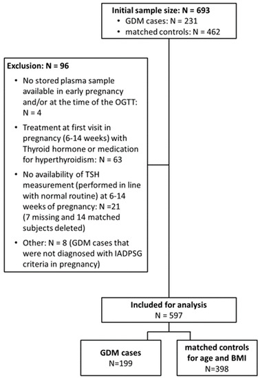 Flow chart of participants included in the sub-analysis. GDM: gestational diabetes mellitus; OGTT: oral glucose tolerance test; TSH: thyroid-stimulating hormone; IADPSG: International Association of the Diabetes and Pregnancy Study Groups; BMI: body mass index.