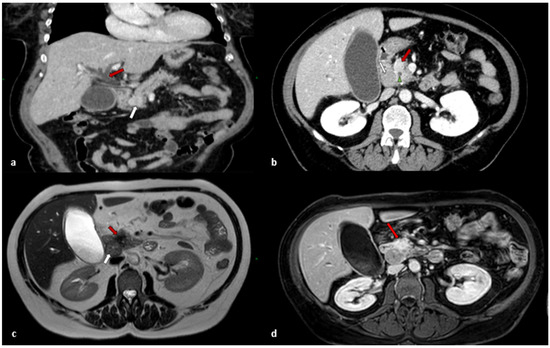 (a) Post-contrastographic CT scan coronal view shows inhomogeneous enhanced expansive solid mass with irregular edges localized at pancreatic cephalic portion (white arrow). The mass exerts compressive effect on the duodenum and choledochus, with evident dilatation of extra- and intra-hepatic biliary ducts upstream (red arrow); (b) Contrast-enhanced CT scan axial view shows inhomogeneous enhanced mass with irregular edges localized at cephalic portion of pancreas (red arrow). Made evident are the dilated choledochus in the context of the mass (green arrowhead) and the presence of enlarged, globose, and inhomogeneous lymph node (white arrow) localized in peri-duodenal region, which is suspicious for metastasis; (c) MRI axial T2-weighted image shows the lesion as hypointense area with badly defined spiked edges lesions (red arrow). It also shows the enlarged, globose metastatic lymph node, which appears slightly and inhomogeneously hypointense (white arrow); (d) MRI gadolinium-enhanced T1-weighted axial image with fat suppression shows intense signal enhancement of the lesion (red arrow).