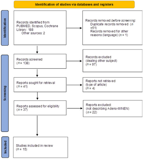 One-hundred and ninety records were identified from database search. Fifty-two records were removed before screening due to being duplicates (n = 51) or written in other language (n = 1). Among 138 records screened by abstract, 97 articles were excluded as not-pertinent. After excluding another 22 not describing adeno-MiNEN, 15 studies met eligibility criteria and were included in the analysis. Study selection is summarized in Figure 4.