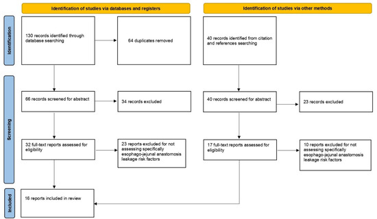 A total of 130 articles resulted from the literature search. Of these, 64 were removed because they were duplicated (PubMed/MEDLINE: 39; Embase: 48; Scopus: 43). Inclusion criteria of 66 articles were evaluated by reading only the abstract, and 34 were excluded because they did not respect them. Thus, 32 full-text articles were evaluated, and a further 23 articles were excluded for not specifically assessing the EJAL risk factors. Another 40 potential articles were identified through references cross search. Of these, 23 were excluded from reading the abstract for not respecting the inclusion criteria. The remaining 17 full-texts were evaluated, and 10 of them were excluded for not specifically assessing the EJAL risk factors. Finally, a total of 16 articles were included in the review (Figure 1).