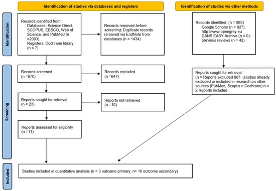 In addition, the gray literature analysis (http://www.opengrey.eu, accessed on 1 July 2022, DANS EASY Archive and Google Scholar) and previous systematic reviews allowed for the identification of two additional studies to be included in the quantitative assessment (Figure 1). The entire procedure for the identification, selection and inclusion of the studies is indicated in the flowchart in Figure 1.