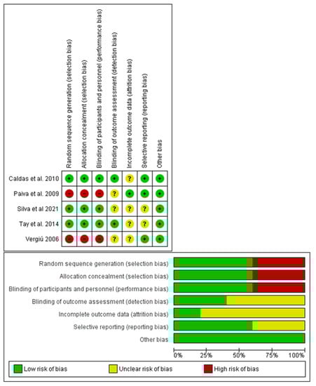 Risk of bias graph for each of the studies included in this review; Tay et al., 2014 [], Paiva et al., 2009 [], Silva et al., 2021 [], Vergiú 2006 [], Caldas et al., 2010 [].