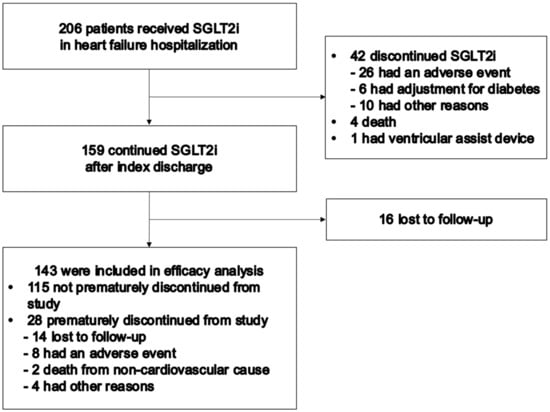 From February 2016 to April 2021, 206 patients initiated SGLT2i during their hospitalization for ADHF. Of them, 42 patients did not continue SGLT2i, 4 died during hospitalization, 1 underwent implantation of left ventricular assist device, and 16 patients were lost to follow-up after index discharge. Finally, a total of 143 patients were included in this study (Figure 1).