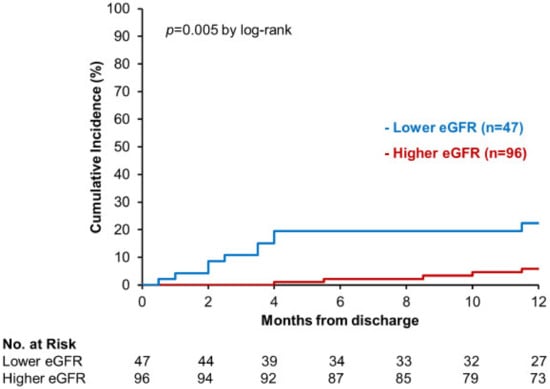 A cut-off of baseline eGFR to predict the primary endpoint was 40.9 mL/min/1.73 m2 (0.744 of area under the curve). A total of 47 patients had eGFR < 40.9 mL/min/1.73 m2 (lower eGFR group) and the other 96 had eGFR ≥ 40.9 mL/min/1.73 m2 (higher eGFR group). The primary outcome was encountered more frequently in the lower eGFR group than in the higher eGFR group (p = 0.005; Figure 2).