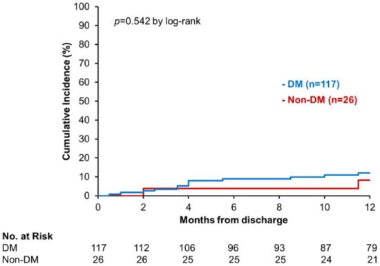 In this study, recurrent HF hospitalization rate was comparable between patients with DM and those without DM. Large-scale trials consistently demonstrated greater risk reduction by SGLT2i regardless of the presence or absence of DM [,,], except for a subanalysis of EMPEROR-Reduced trial, in which the impact of empagliflozin was neutral among those without DM []. Patients with DM might have favorable clinical benefit by SGLT2i during an acute phase, whereas its benefit might be compensated by relatively worse long-term prognosis of DM cohort []