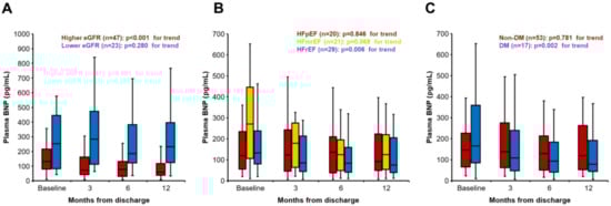 Changes in plasma B-type natriuretic peptide (BNP) level during the observational period. (A) Stratified by baseline estimated glomerular filtration rate (eGFR). (B) HFrEF/HFmrEF/HFpEF cohort. (C) DM/non-DM cohort. Variables were expressed as median and interquartile.