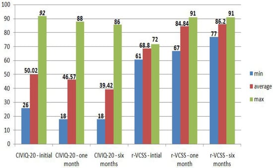 CIVIQ-20 and r-VCSS results at baseline, one month, and six months among the study group.