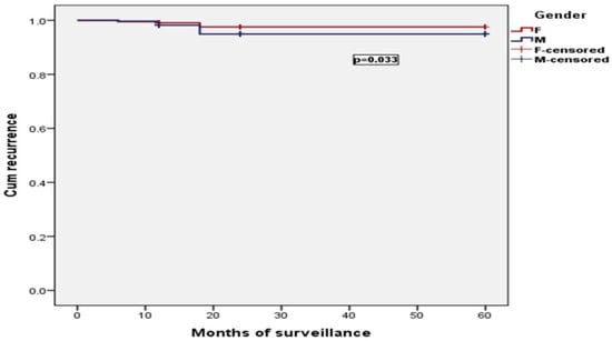 The frequency of recurrence was statistically significantly influenced by the gender of the patients (p < 0.001).