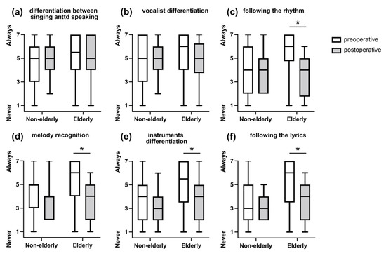 Comparison of music elements between the non-elderly group and the elderly group before and after receiving a cochlear implant. (a) Ability to perceive the difference between singing and speaking; (b) ability to differentiate between a male and a female vocalist; (c) ability to follow the rhythm; (d) ability to recognize the melody; (e) ability to differentiate the instruments; (f) ability to follow the lyrics. The elderly group shows significant declines in postoperative scores for rhythm, melody, timbre, and lyrics compared with their preoperative scores. No significant change is observed for any factor in the non-elderly group. * p < 0.05.