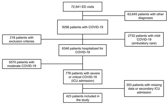 Between 1 March and 30 April 2020, the ED of all nine participating hospitals witnessed a total of 72,941 patient visits, out of whom 9296 (12.7%) were diagnosed with COVID-19. The ICU received and managed 776 of these patients. Conclusively, after excluding patients with missing data and those secondarily admitted to the ICU, a total of 423 patients were included in this study (Figure 1).